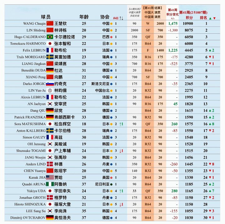 男单前十的人员没有变化,但是排名情况出现3处改变。中国大满贯上夺得亚军的F·勒布伦排名上升两位,重新回升到世界第五。莫雷加德和梁靖崑则双双被挤落1位,现局第六和第七。