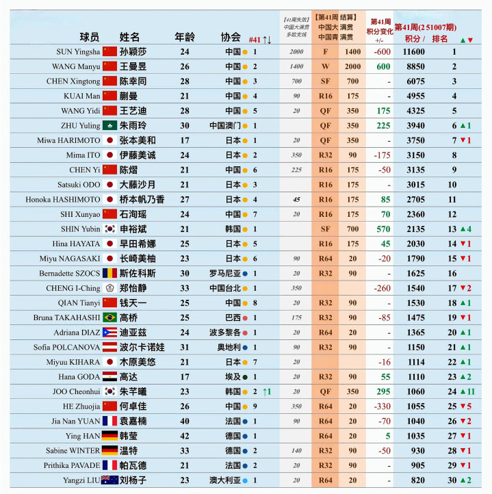 北京时间10月7日,国际乒联2025第41周世界排名发布。WTT中国大满贯的成绩积分被加入结算,中国男队主力王楚钦世排积分达到10900分,成为首位积分破万的男单选手,与孙颖莎再次配平,两人首度成为“双破万的双世一”!